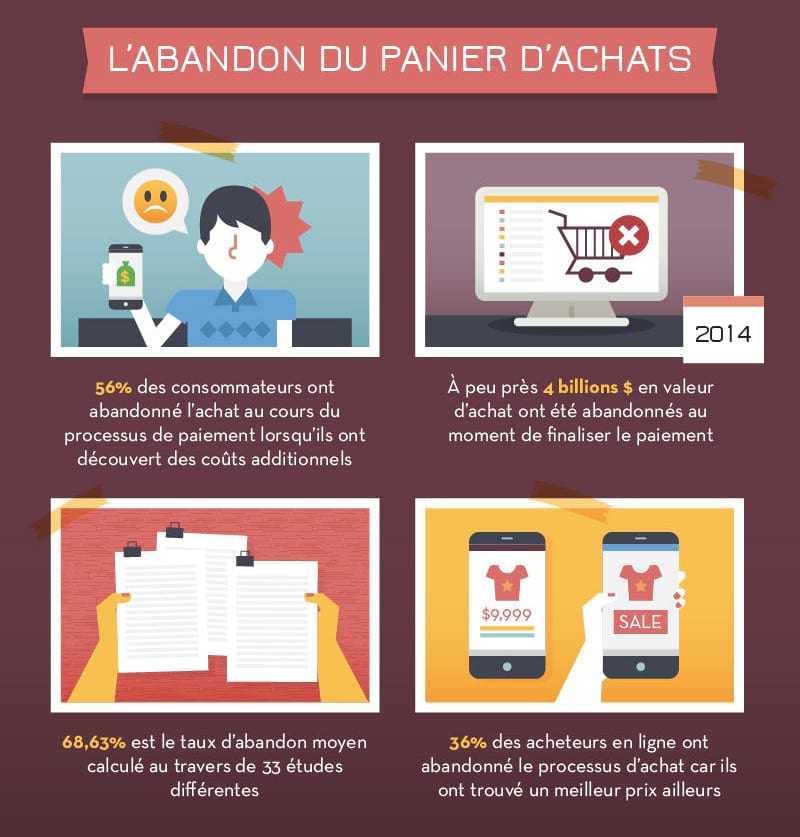 1) Taux d'abandon du panier Source: Fevad On parle d’abandon de panier, lorsque le visiteur d’un site de vente en ligne, ajoute un produit à son panier mais ne finalise pas sa commande. On peut constater que 7 visiteurs sur 10 qui mettent un produit dans leur panier ne finalisent pas leur commande. 2) Les raisons de l'abandon Source : fevad/blog.lkconseil.com Les tops 3 des aban...
