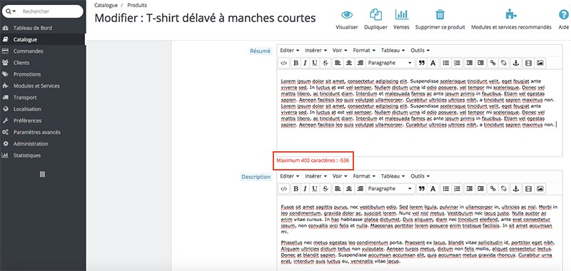 Lors de la création de la fiche produit sur Prestashop, vous serez peut-être être bloqué par la limitation du nombre de caractères de la description courte (maximum 400 caractères)