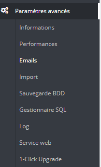 Depuis votre back-office, dans le menu de gauche, cliquez sur Paramètres avancés > E-mail
