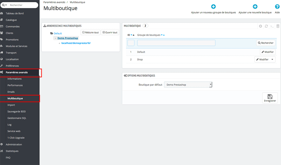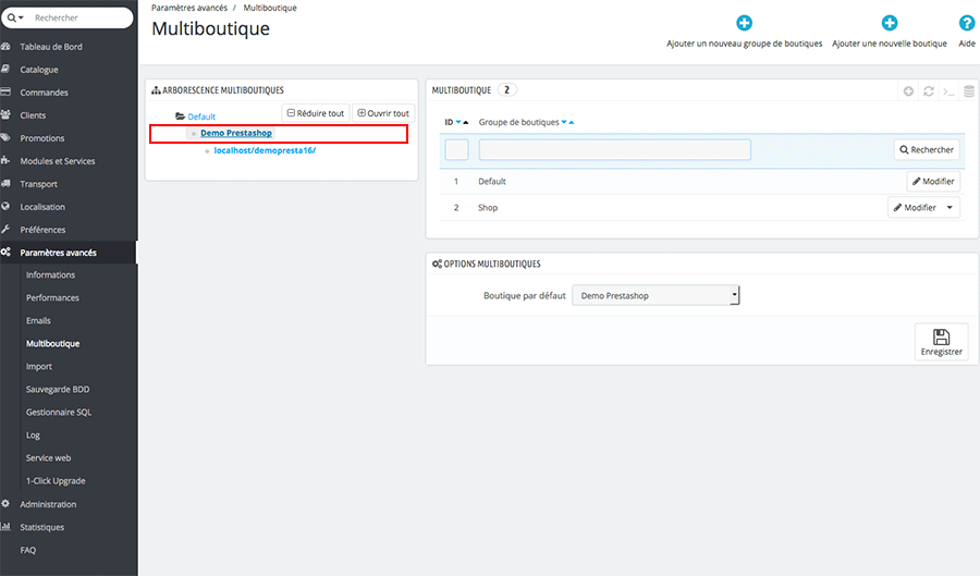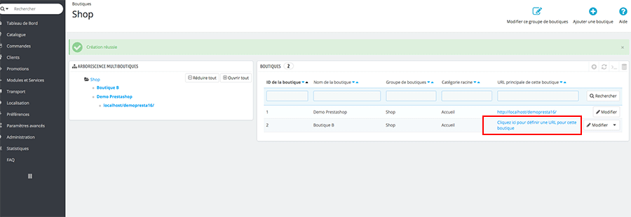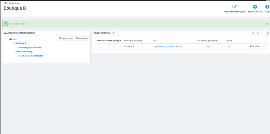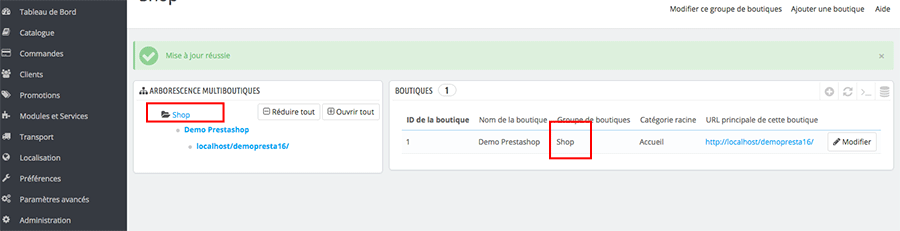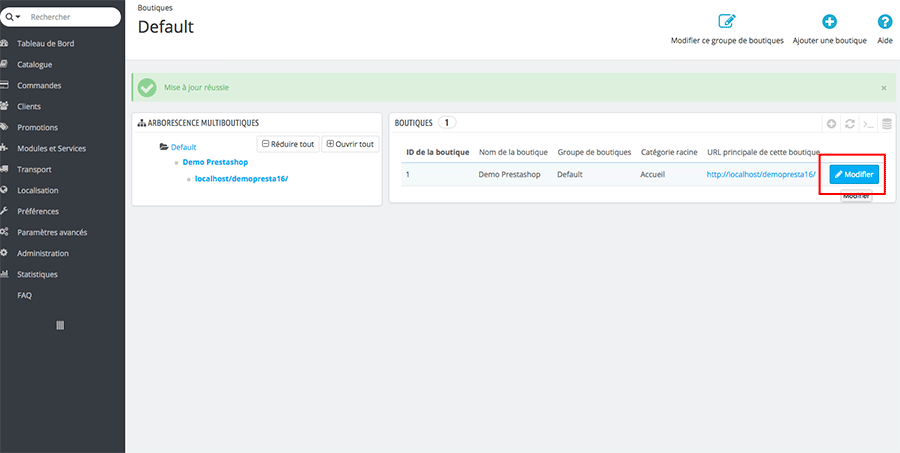 Dans l’ Arborescence multiboutiques , cliquez sur le nom de votre première boutique dans l’exemple Démo Prestashop. Puis cliquez sur le bouton Modifier en bout de ligne