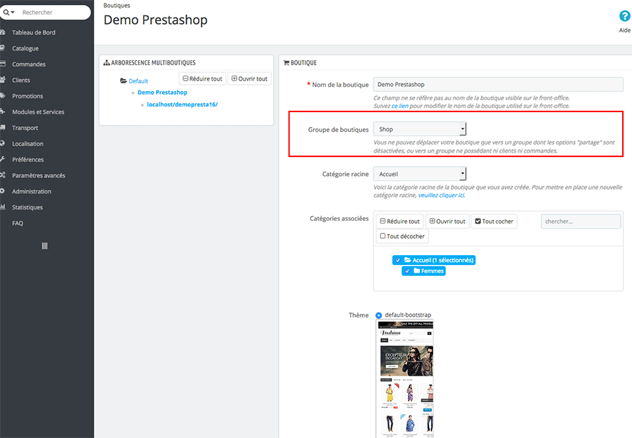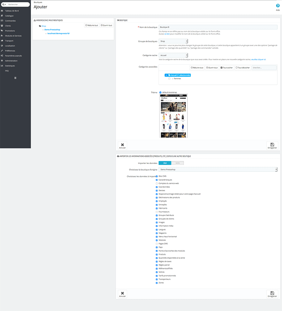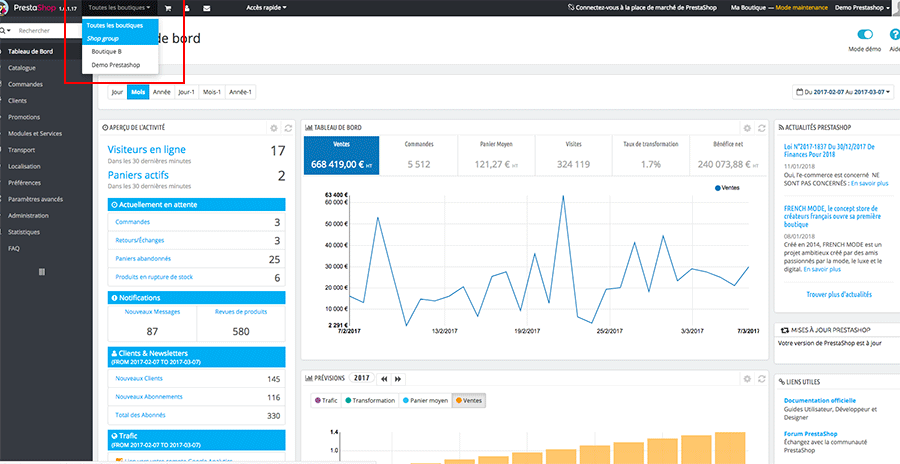 La multi-boutique est un groupe de boutiques qui partage la même administration. Vous pouvez donc gérer plusieurs boutiques avec un même back-office PrestaShop.