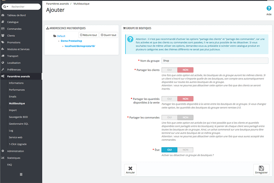 Partager les clients : si vous activez cette option, toutes les boutiques de ce groupe partageront les mêmes clients. Un client qui s’enregistre sur la boutique A sera obligatoirement enregistré sur la boutique B. Attention : vous ne pourrez pas désactiver cette option une fois que des clients se seront inscrits.