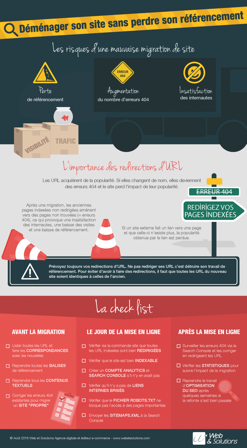 Dans ce cas je vous conseille de jeter un oeil à cette infographie (réalisé par Web et Solutions) qui propose une check-list des points importants à mettre en place lorsqu’on effectue une migration de site.