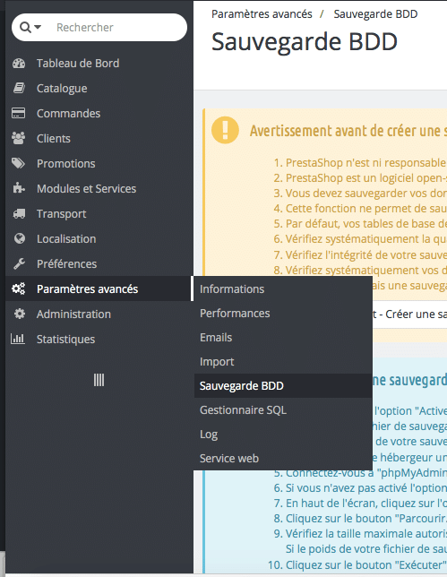 Depuis la back-office de Prestashop, allez dans l’onglet Paramètres Avancés > Sauvegarde BDD