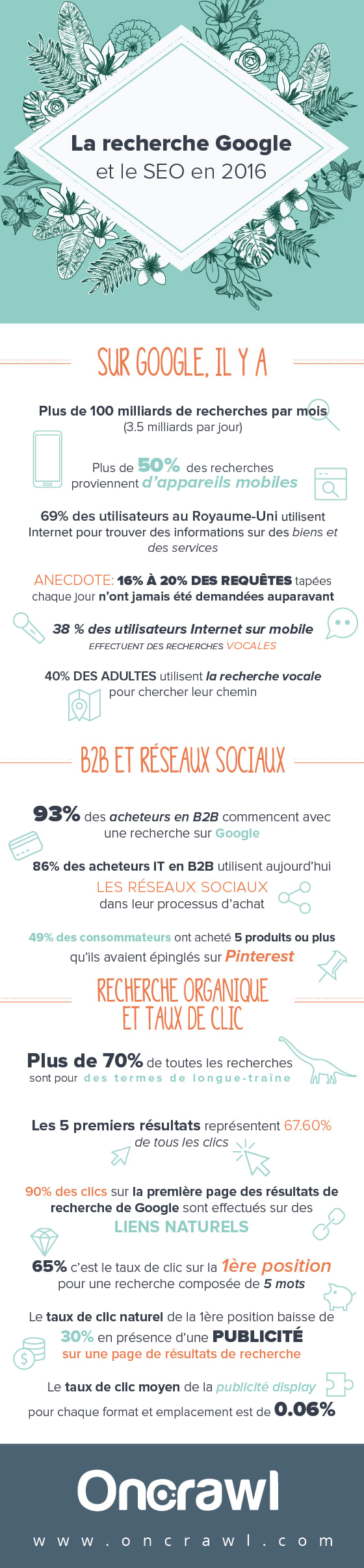 Cette infographie proposé aujourd’hui par OnCrawl nous montre quelques chiffres la recherche d’informations sur Google et le référencement naturel.