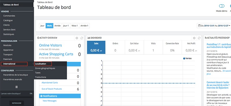 1) Depuis le back-office de Prestashop, dans la colonne de gauche, allez dans International > Localisation