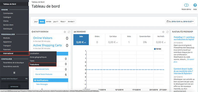 1) Depuis le back-office de Prestashop, dans la colonne de gauche allez dans International > Traductions