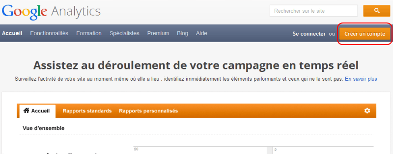 Allez sur le site suivant https://www.google.fr/intl/fr/analytics/ et cliquez sur le bouton « Créer un compte »