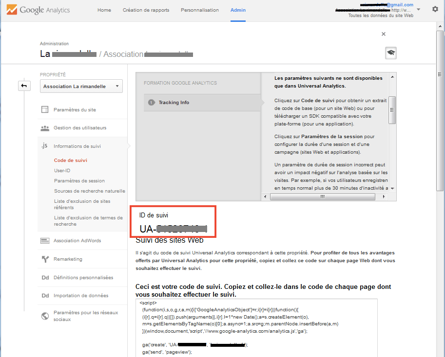 Notez le code ID de suivi, il vous servira pour paramétrer le module de Prestashop