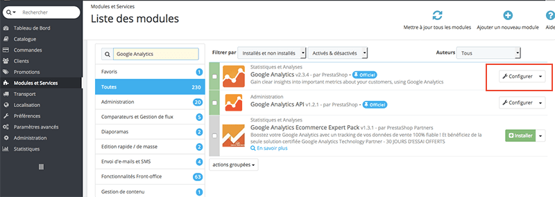 Une fois le module Google Analytics trouvé, cliquez sur « Configurer » (s’il n’est pas installé, cliquez sur « installer »)