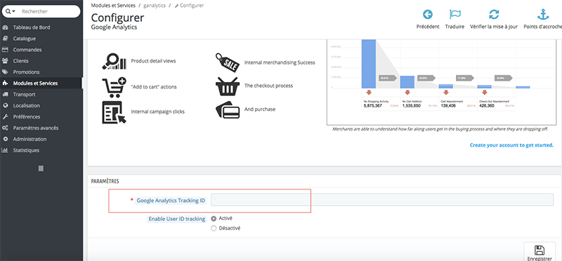 Maintenant que vous avez créé votre compte Google Analytics et notez le code ID de suivi, vous allez dans le back-office de votre boutique Prestashop, puis suivez les étapes suivantes :