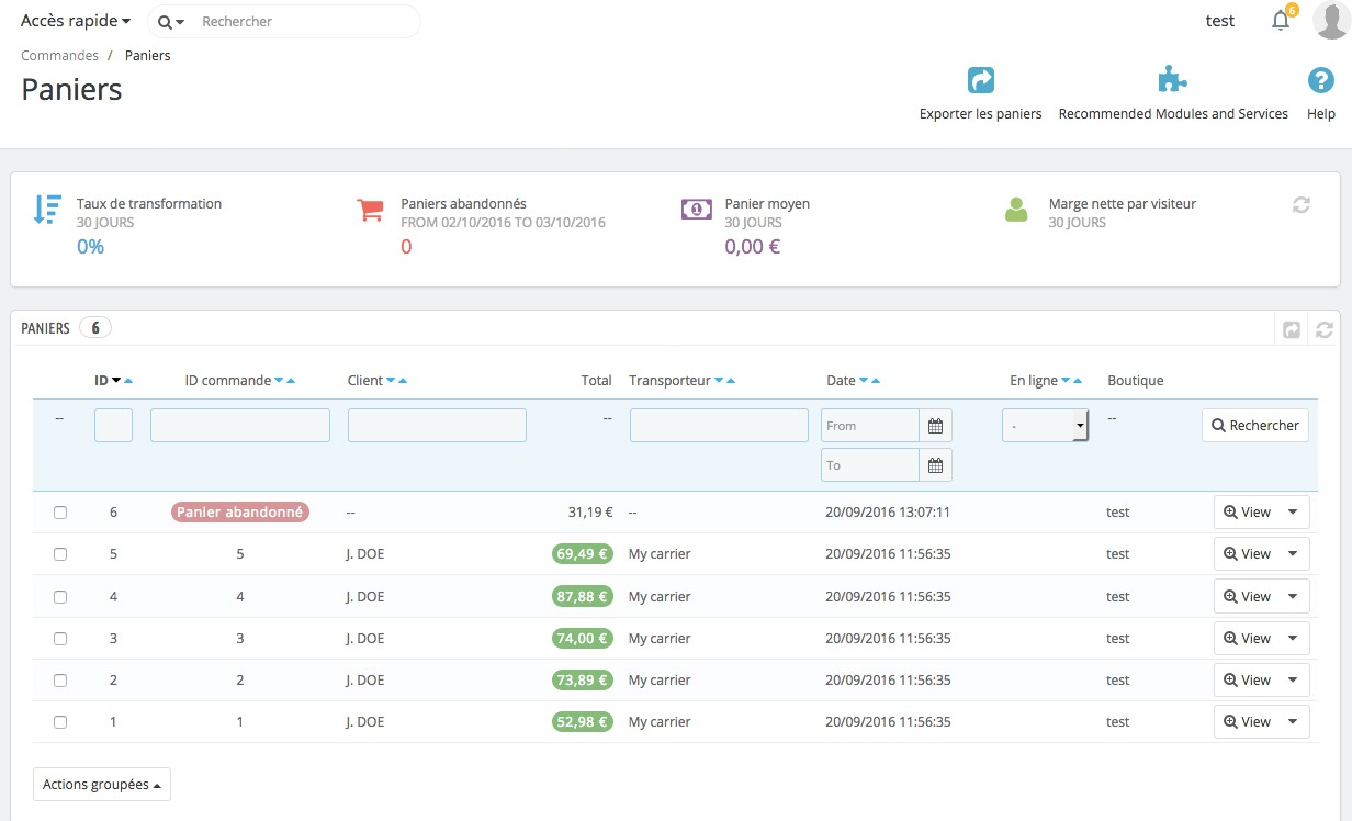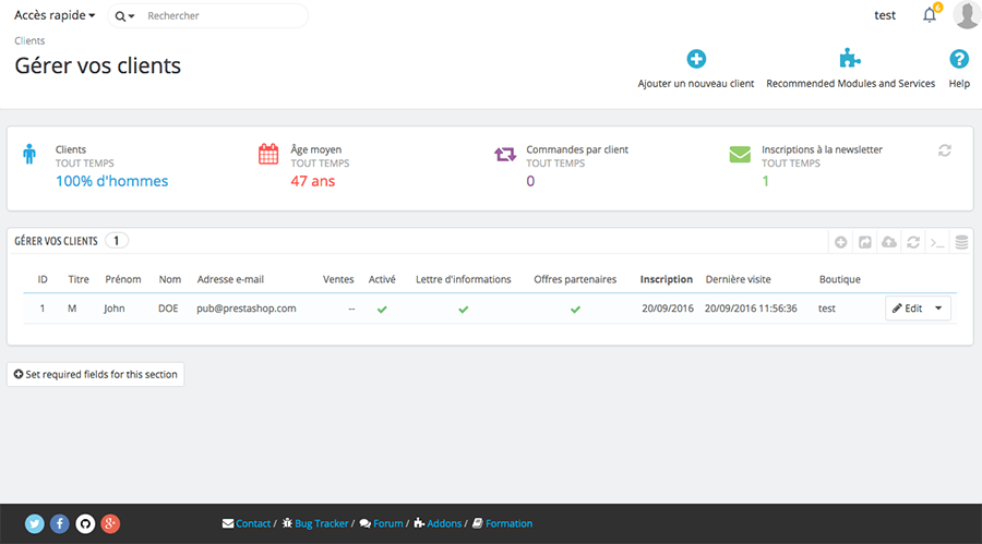 Cette page donne la liste de l’ensemble des clients qui se sont enregistrés sur votre boutique.