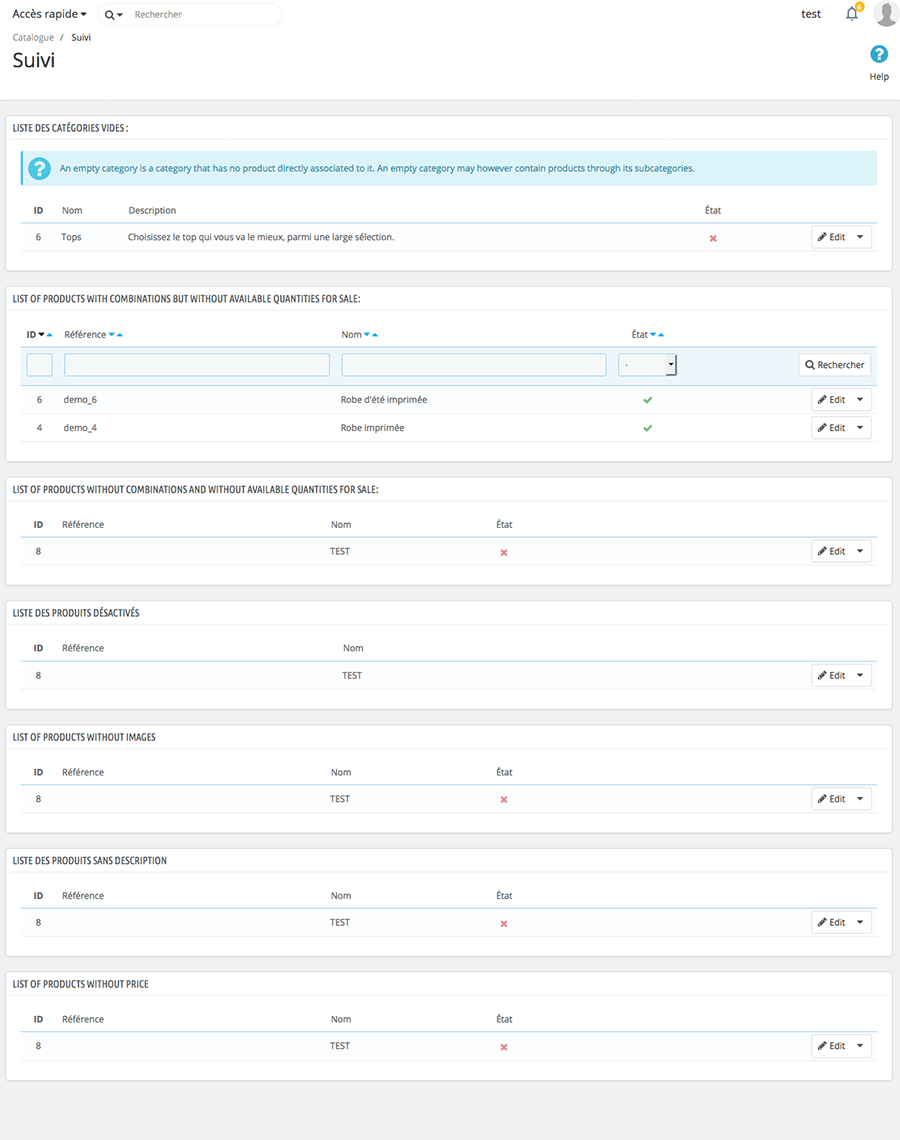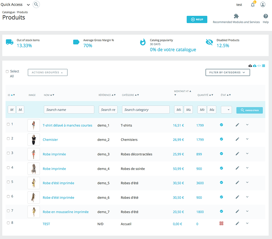Permet de regrouper les produits en différentes catégories. Par exemple vous pouvez visualiser les produits désactivés, les produits hors stocks, les produits sans prix…..