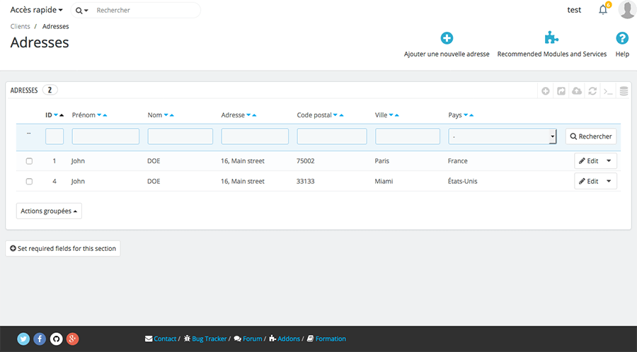 Cette page  donne l’adresse de tous les clients qui se sont enregistrés sur votre boutique.