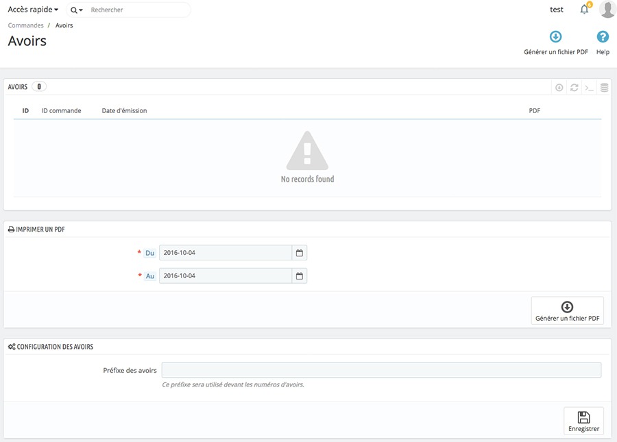 Si un client retourne son produit et que vous l’avez accepté, un avoir sera généré depuis la page commande. L’onglet « Avoir » liste  l’ensemble de ces avoirs. Elle permet aussi de générer les avoirs au format PDF.