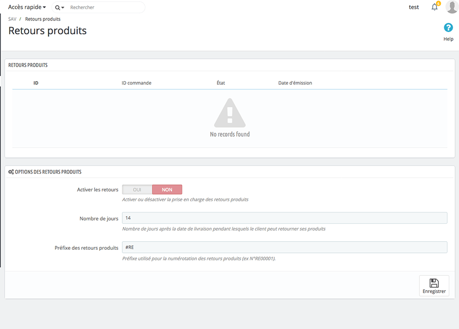 La page « Retours produits »,  permet de paramétrer le processus du retour de votre produit.