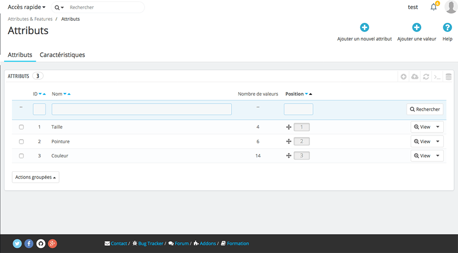 Cette page est la base de toutes les déclinaisons de produit, elle  permet par exemple de créer différents attributs et ses valeurs. Exemple l’attribut Taille avec comme valeur : S / M / L
