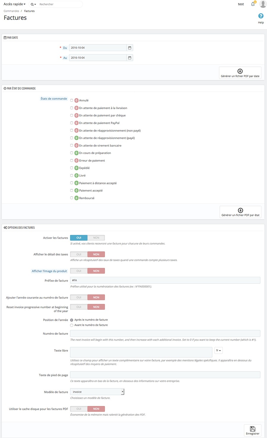 Chaque fois qu’une commande est effectuée sur votre site, une facture peut-être envoyée par mail à votre client. Vous pouvez retrouver dans cet onglet, les factures au format PDF et les paramétrer.