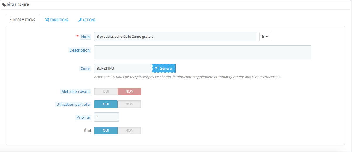 – si vous souhaitez que la promotion se fasse par un bon de réduction saisissez ce code dans le champ « Code ».