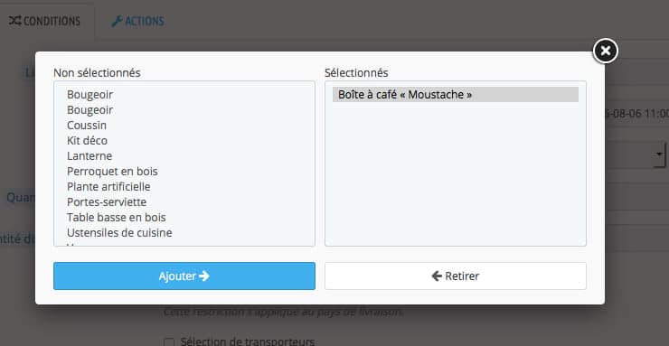 – Un pop-up s’affiche, choisissez le produit offert dans la partie « Non sélectionnés » à gauche, et cliquez sur le bouton « Ajouter » pour le déplacer dans la partie « Sélectionnés » à droite. Une fois que le produit voulu a été sélectionné, cliquez sur la croix en haut à droite
