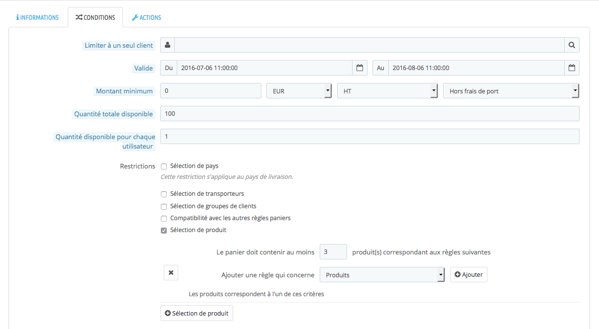 – insérer 3 dans « Le panier doit contenir au moins 3 produit(s) correspondant aux règles suivantes