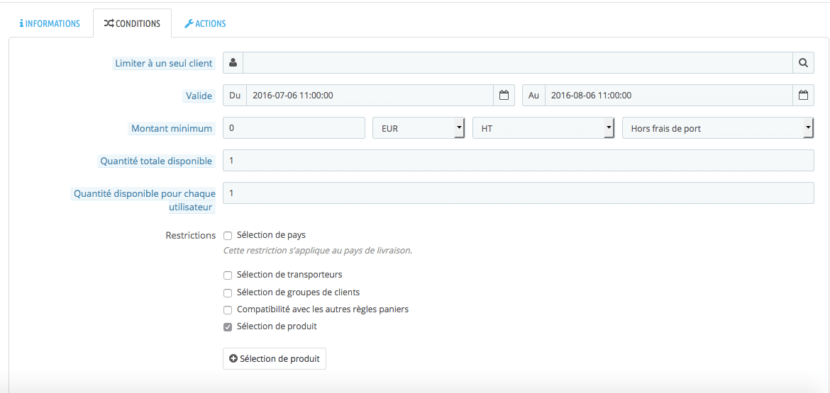 – cochez la case « Sélection de produit » (en bas)