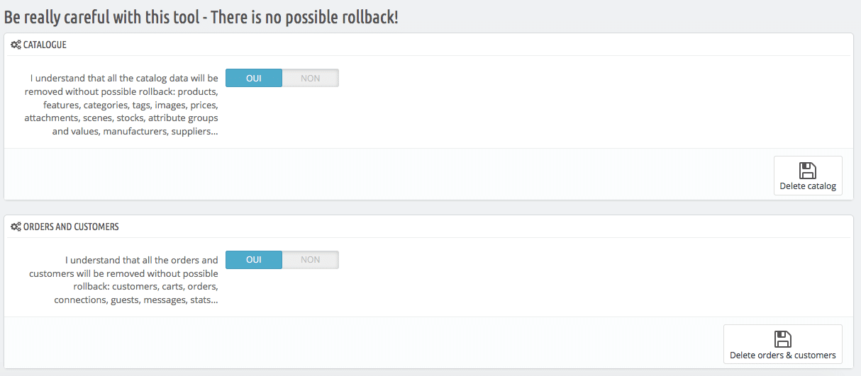 La première section « Catalogue », permet de supprimer l’ensemble des catégories, produits, fournisseurs….. Choisissez « oui » et cliquez sur « Effacer le catalogue » (delete catalog)