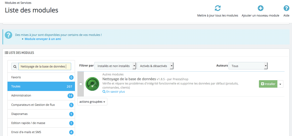 3) Recherchez le module qui s’appelle : Nettoyage de la base de données » (PrestaShop Cleaner) et cliquez sur installer