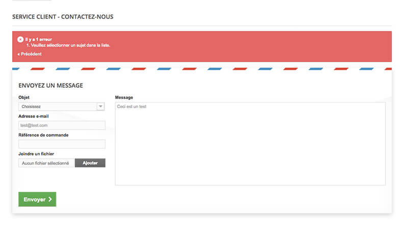 Si le client oublie de faire sa sélection (par défaut Service client ou Webmaster), Prestashop va générer une erreur.
